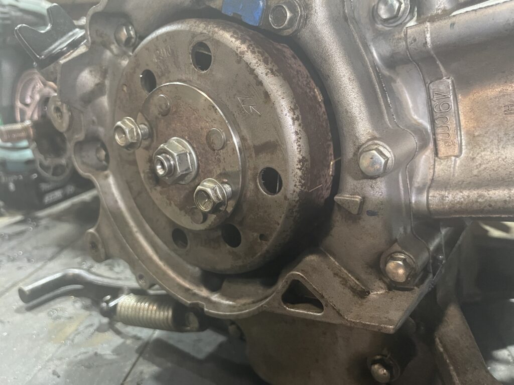まずは、フライホイールの取り外し方からです。フライホイールにプーラーを取り付けてインパクトで回して取り外します。また、手持ちのプーラーは幅がギリギリだったので、少し穴を削って使用しました。フライホイールを取り外したら次は、中のコイルも外しておきましょう。